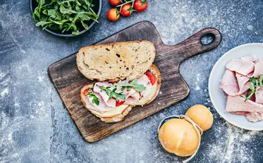 Sandwich scarmoza fumée, roquette, tomates cerises & rostello aux herbes