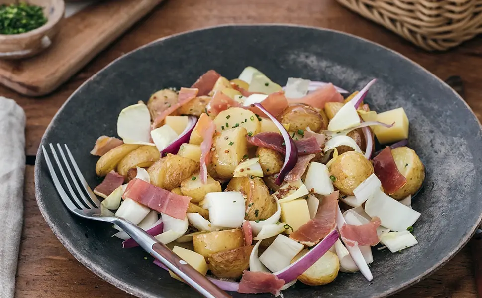 - élanger les pommes de terre tièdes avec les endives, ajouter les oignons rouges, les allumettes de jambon sec, une pincée de ciboulette et quelques cubes de Beaufort.